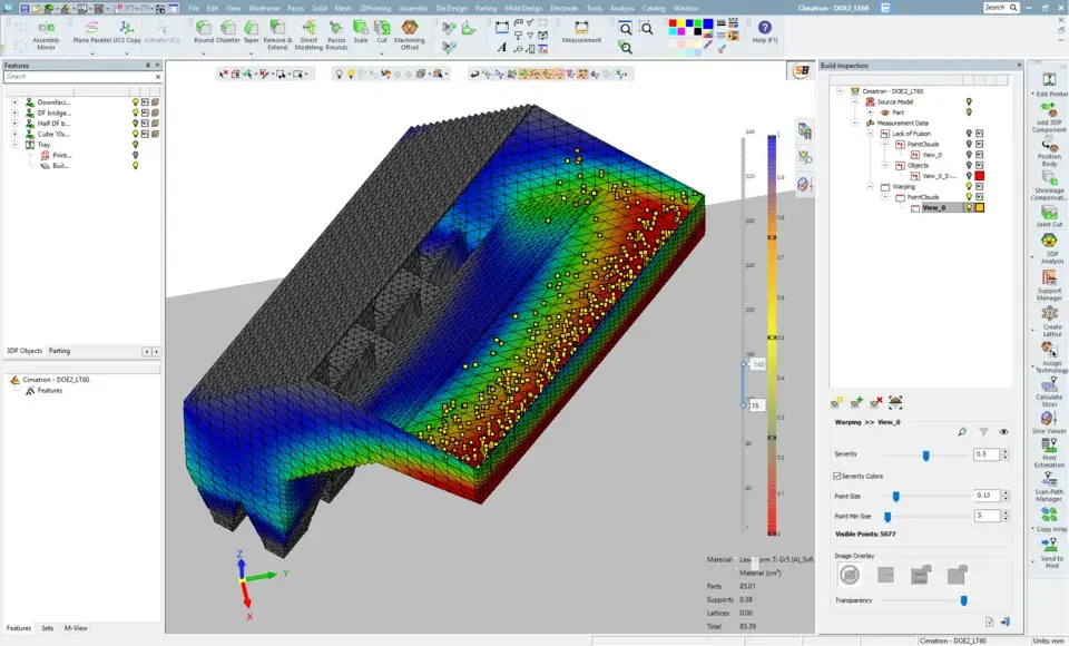 Notre équipe de scientifiques et d'ingénieurs spécialisés dans les matériaux et les procédés a développé des algorithmes qui montrent un haut niveau de corrélation avec les résultats des tomodensitométries, permettant une détection automatisée des incidents après la fabrication. Dans une étude, une corrélation de 100 % des résultats d'analyse de la surveillance DMP sans fusion trouvée dans les données de tomodensitométrie pour les défauts > 200 μm a été vérifiée pour une variété de test représentative de pièces en LaserForm Ti Gr23 (A) et acier maraging (A) imprimées sur l'imprimante 3D métal DMP 320.