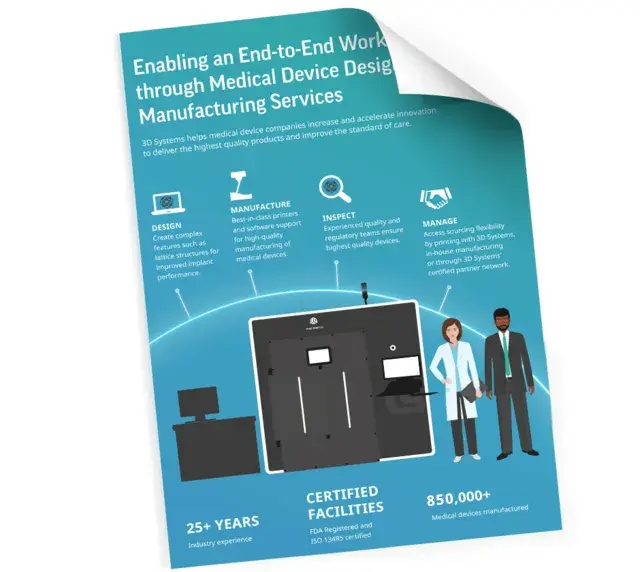 Avec une expérience dans la fabrication de près d'1 million de dispositifs médicaux, à commencer par le tout premier implant en titane imprimé en 3D approuvé par la FDA, 3D Systems propose un écosystème de logiciels, de technologies, de services et de conseils professionnels, et est le premier choix du secteur des dispositifs médicaux. Ses installations de classe mondiale, certifiées ISO 13485, enregistrées auprès de la FDA, situées en Amérique du Nord et en Europe, fournissent un savoir-faire précieux dans les domaines de l'impression 3D, de l’ingénierie, du contrôle de la qualité et de la réglementation. 3D Systems a aidé divers profils de clients, des leaders du secteur aux start-ups innovantes, à développer un portefeuille varié d'applications de précision pour la santé et de technologies médicales révolutionnaires, en permettant à ses partenaires de commercialiser plus vite que jamais des dispositifs médicaux novateurs.