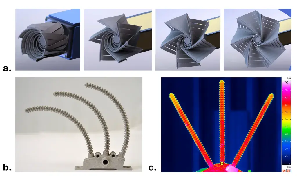 Figure 2 : a. Concept de radiateur en alliage à mémoire de forme (SMA) fabriqué de manière additive avec des ramifications de caloducs radiaux se déployant à partir d'une forme de rangement compacte. b. Prototype de démonstrateur SMA avec des bras de caloducs à soufflets hautement flexibles. c. Image thermique d'un caloduc à soufflets ramifiés SMA, montrant un fonctionnement presque isotherme. (Images reproduites avec l'aimable autorisation de l'université Penn State)